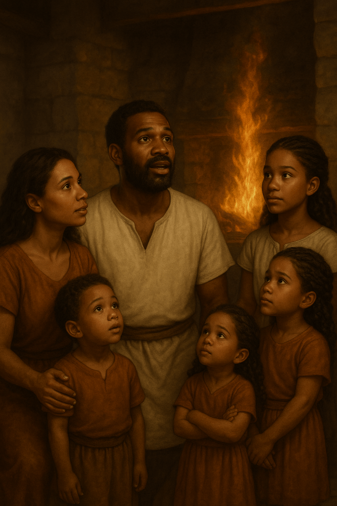 The warm fire crackled inside the family’s small home near the mountain. Daddy had gathered everyone in close. The mountain still rumbled in the distance, glowing with Yah’s power. Everyone could feel it in their hearts—Yahuah was near.