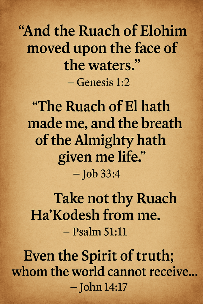 In the Hebrew Scriptures, the word for spirit is “Ruach” (רוּחַ) – meaning breath, wind, or life-force. The title “Ha’Kodesh” means **Set-Apart**. Together, Ruach Ha’Kodesh means **The Set-Apart Spirit**—not common, not profane, but holy, clean, and consecrated for Yahuah’s purposes.